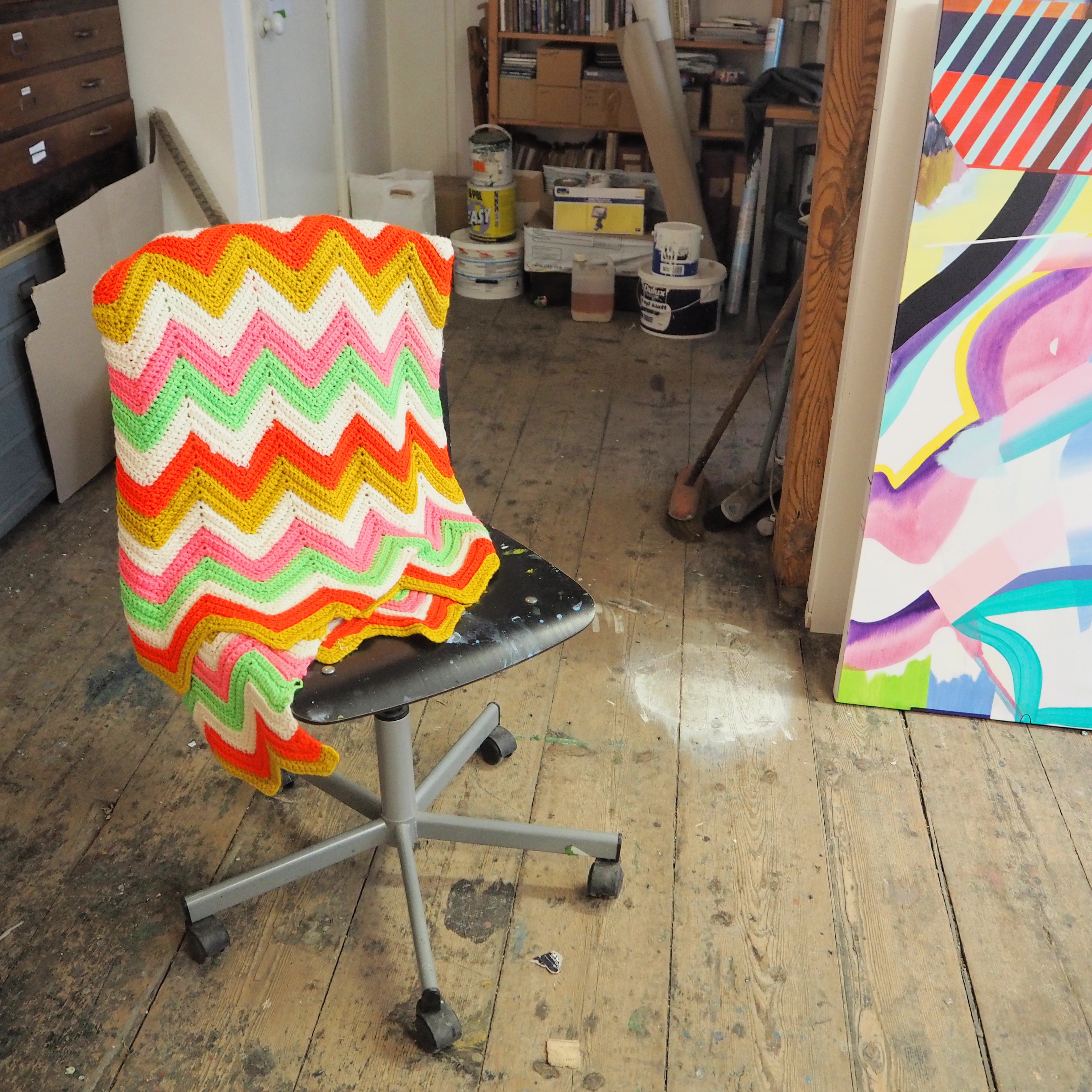 I love seeing the items and objects that artists surround themself with in order to create (Danny is very pleased with this patterned blanket which was picked up on ebay for a tenner!). He is just as knowledgeable about music as he is art (he DJ’d for a while) and has an impressive collection of vinyl; his recent exhibition at Barbara Davis Gallery in Houston, Texas is named after a line in a John Denver song – ‘Painted on the Sky’.