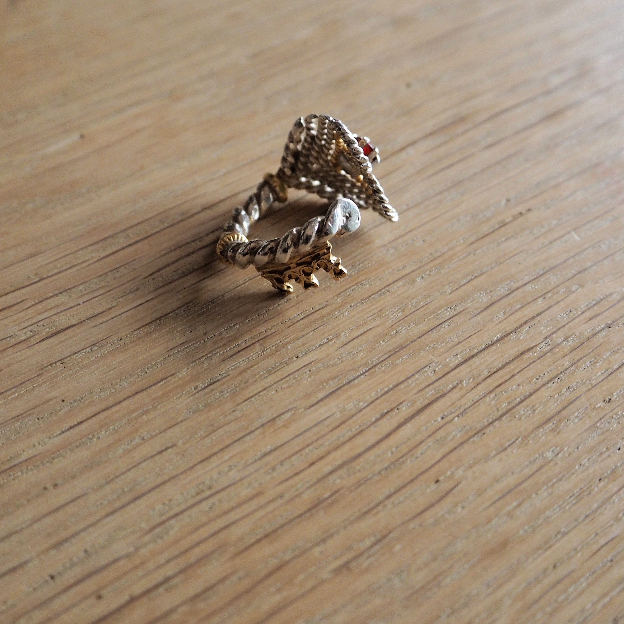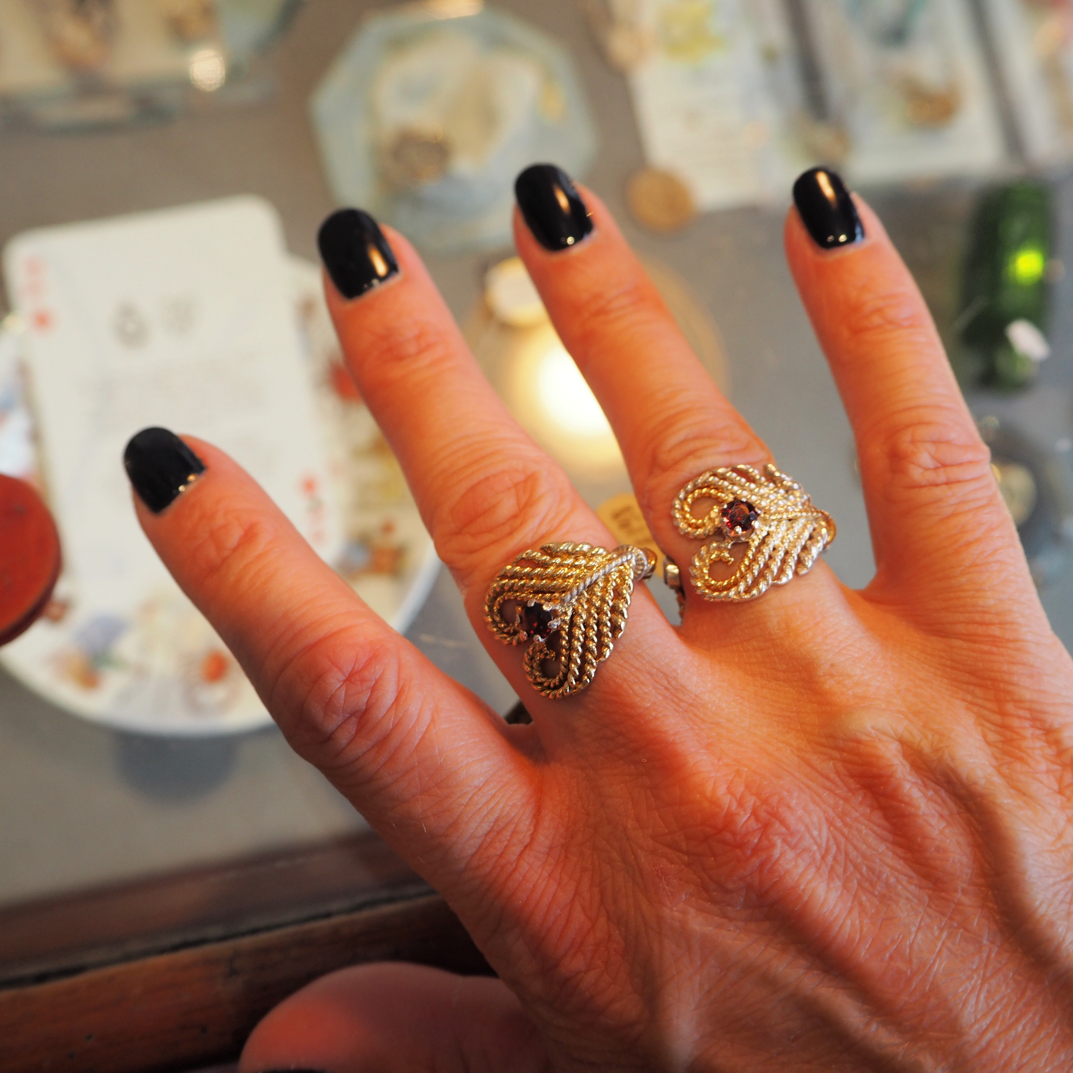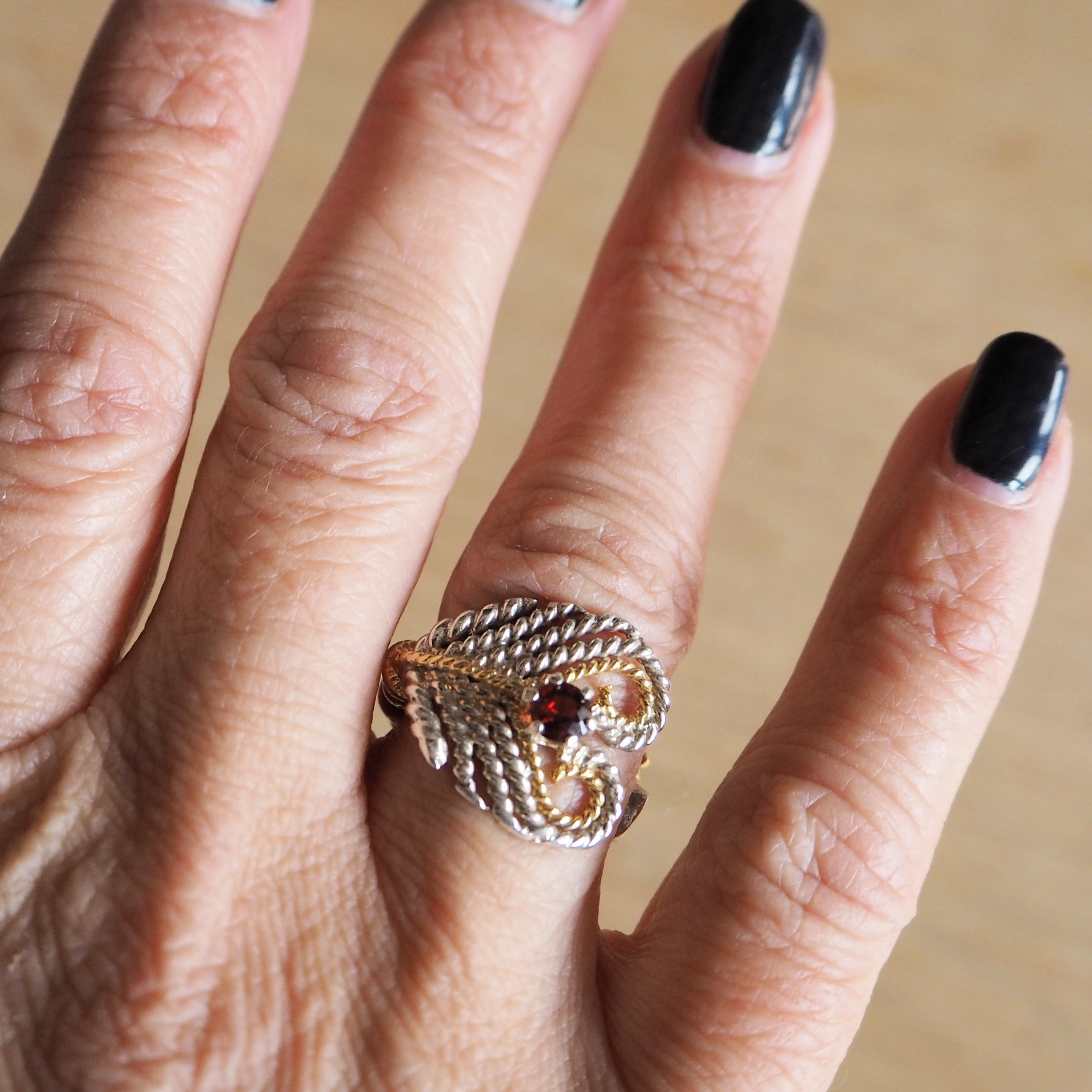 I’m a very In the Now person. I see something and I want it immediately. I’ll wear newly bought shoes straight out the shop for example. But Jessica is the jewellery version of the Slow Food movement. She makes to order. Her work is considered, precise, personal. Me being me, I bought something in the shop to wear straight away anyway. This gorgeous peacock feather key Ring, made from twisted gold and silver with a tiny garnet. Its intricate and extremely beautiful, designed to represent Gladys’ coming of age and the key to adulthood.
