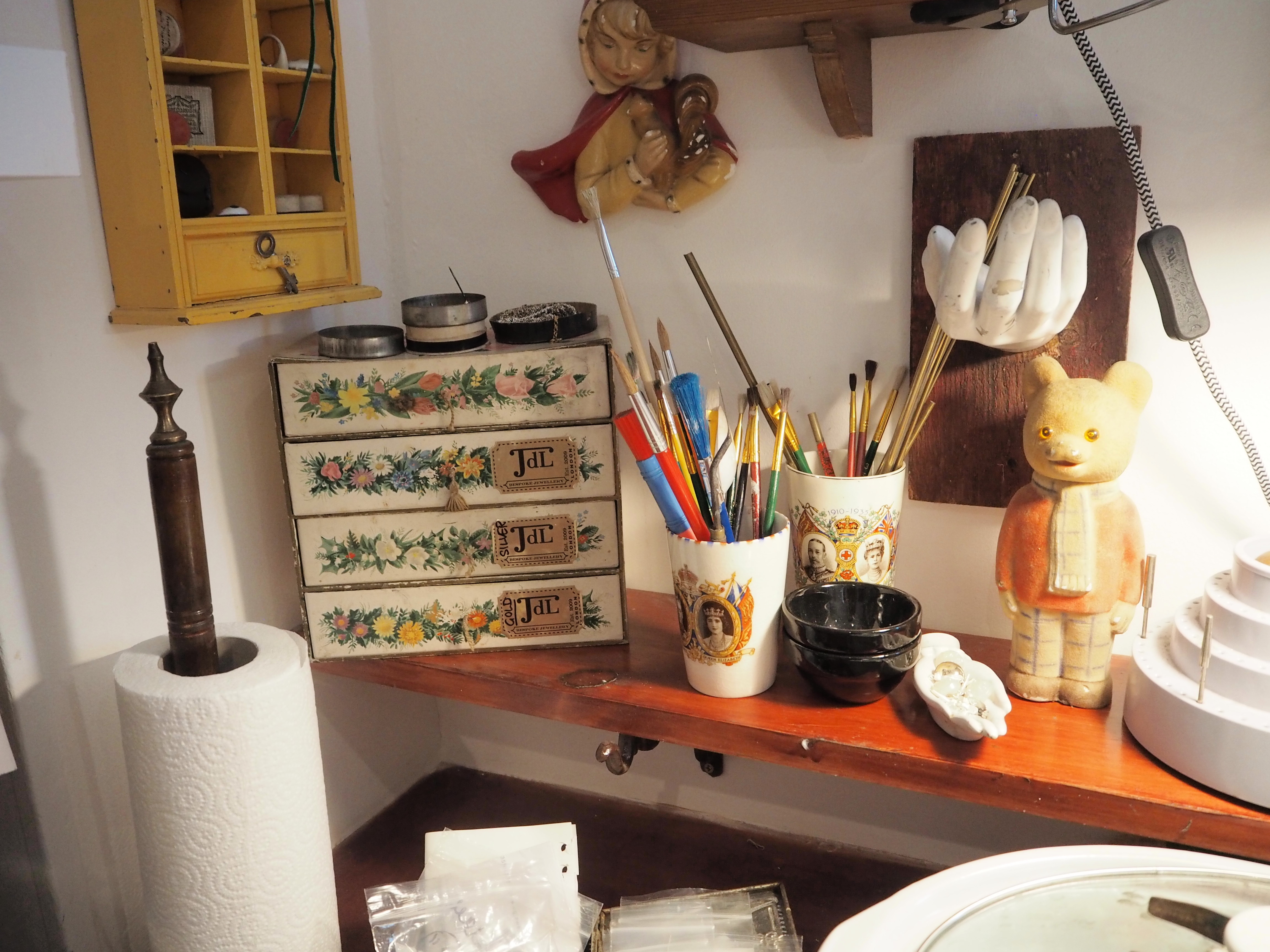 The studio is separated from the shop by a peephole that allows you to glimpse through to the craftswoman at work.
