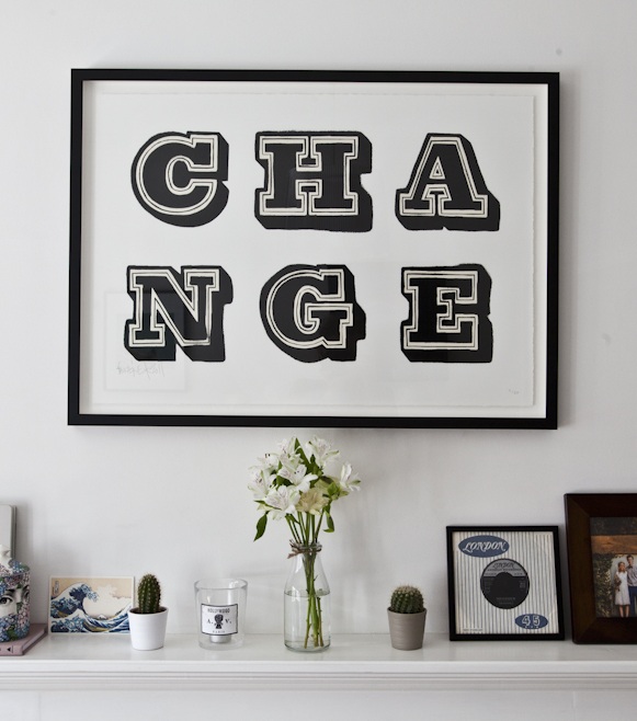 Q1: What is your favourite artwork and where is it from? A Ben Eine ‘Change’ limited edition signed screen print. I bought it from Nelly Duff on Columbia Road as one of my first pieces of Art when we bought our first flat. I still love it now and am excited to put it up in our new home.