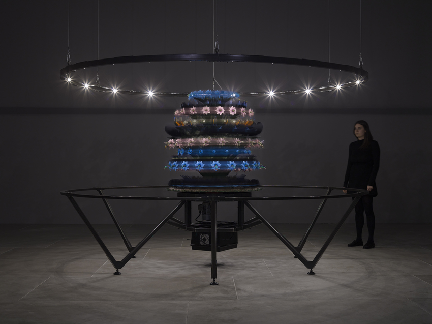The Centrifugal Soul is the title work and centrepiece of Mat Collishaw’s exhibition at Blain|Southern. It is a sculpture in the form of a zoetrope, which animates scenes of bowerbirds and birds of paradise as they perform elaborate mating rituals.