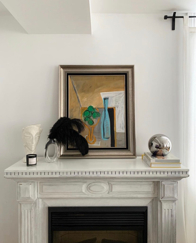 It stands above our electric fireplace in the living room, together with vintage statues, vases and some art books.