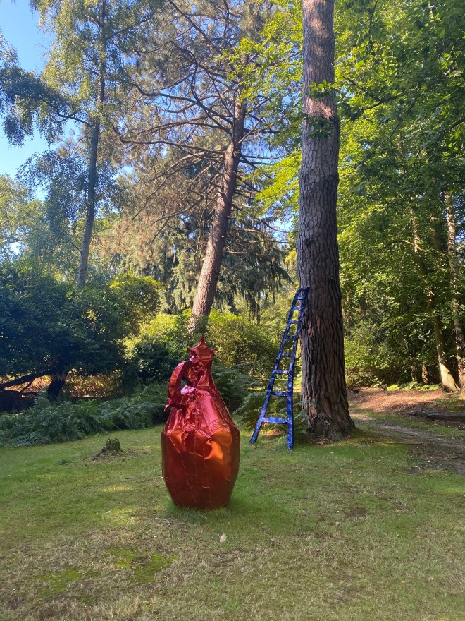 Continuing our walk through the woodland, next up are two shiny gem coloured steel pieces by Jesse Pollock. Their physicality is immediate – an oversized cider pot and a rickety ladder – but it’s the old English phrases scarred on to the surfaces that intrigue me – ‘Lickpenny’ and ‘Flogging a dead horse’. George explains the artist is fascinated by the British vernacular, particularly in his home of rural Kent.