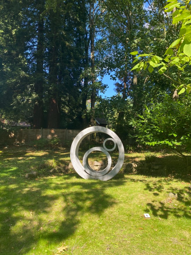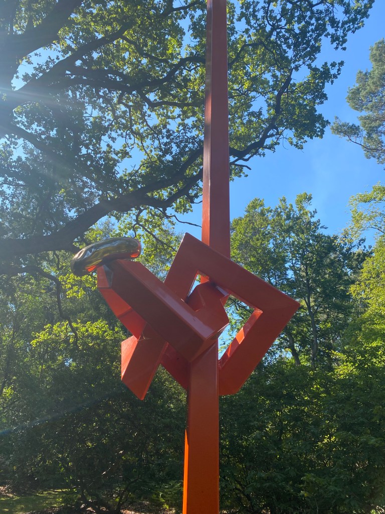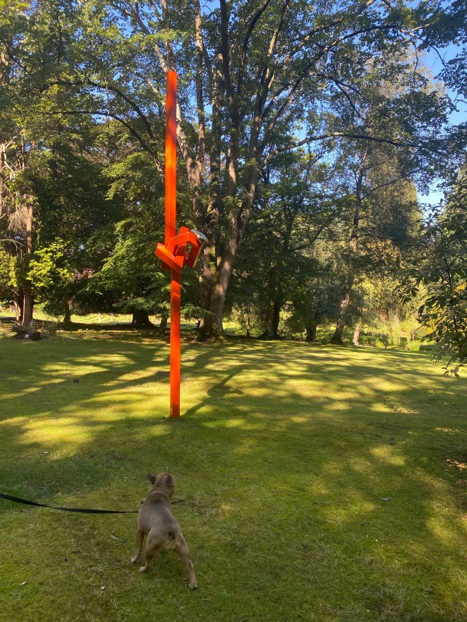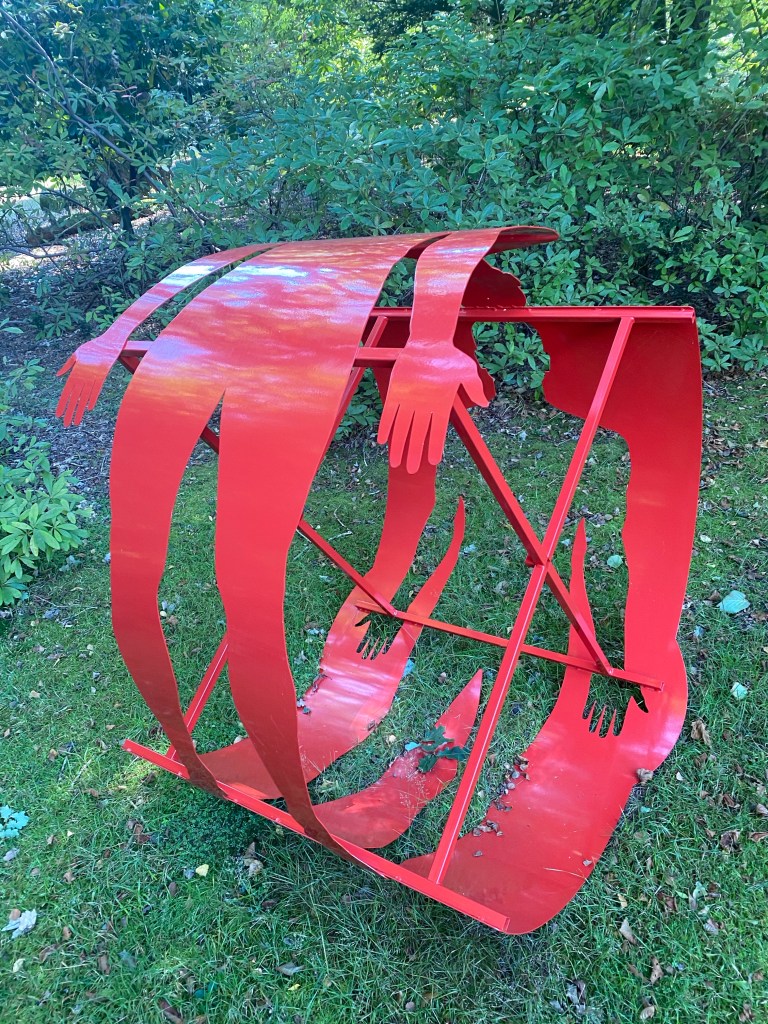 ‘Rat Race’ 2020 by Lucy Gregory is a red powder coated steel piece that looks like it could roll across the manicured lawn with the slightest of pushes. I’m tempted but George tells me its not actually designed to roll as the artist enjoys playing with the idea of potential and constraint.