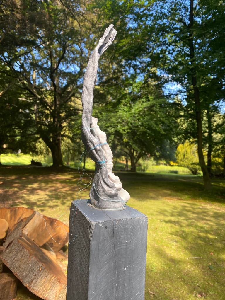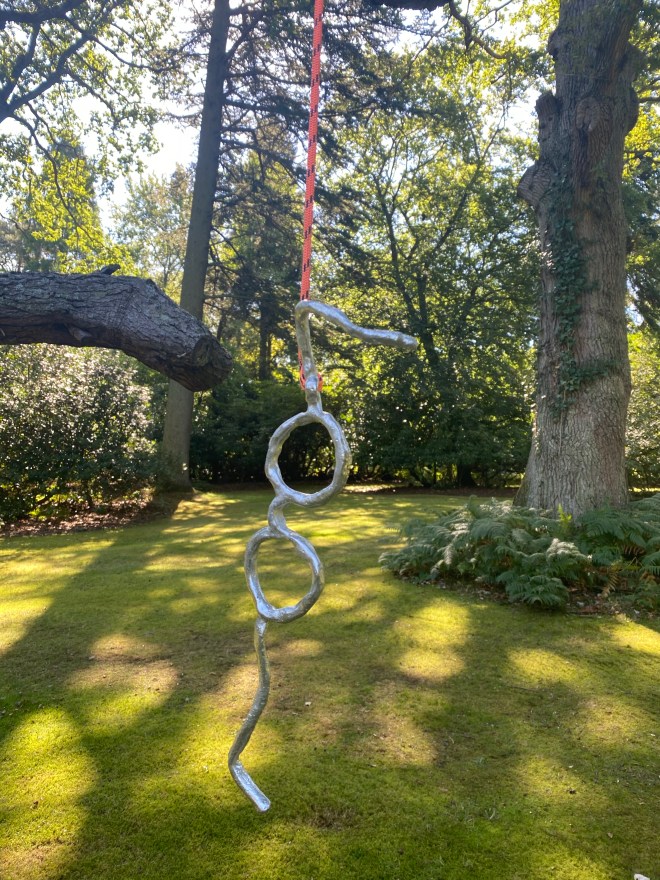 A small, intricate sculpture ‘No Letting Go’ 2015/20, stands atop a wooden plinth in the shade.. Less immediate than its fellow works, but hugely intriguing,. it’s by Katrin Hanusch. Hanusch is an artist whose work explores the balance between beauty and coarseness, chance and failure. The work is based on a 3D scan of a leaf. During the printing process part of the data was lost, resulting in the loss of a rectangular section of the piece. The partly printed leaf is presented with found twine and a slate block that was discarded by another artist. It’s a delicate, elegant object, a partly manmade creation of chance sitting amongst the early autumn leaves that have fallen from neighbouring trees.