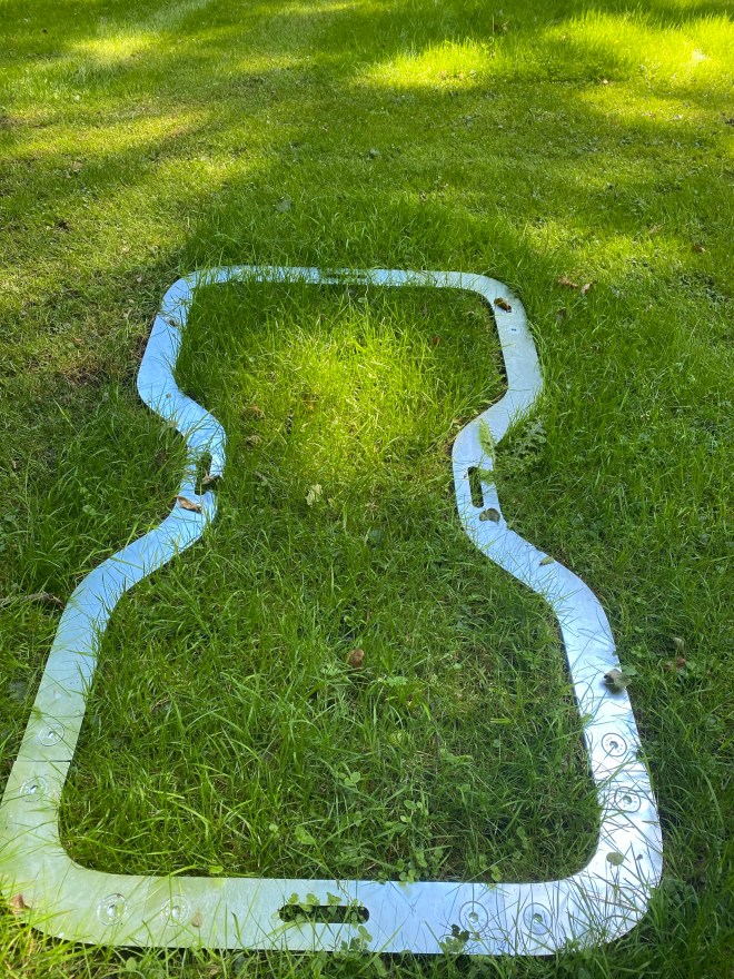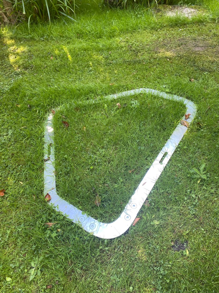 We nearly miss the next four works as they’re embedded into the ground (and the grass has been growing!). Based on an ongoing project with South African interdisciplinary artist Jessica Doucha, these works by Marco Miehling investigate how artists can work together from distant locations. ‘Sections: ongoing’ 2020 are steel shapes that provide a space for physical performances to take place. The shapes can be reproduced and laser cut in different locations, allowing simultaneous performances to occur across venues in multiple countries.