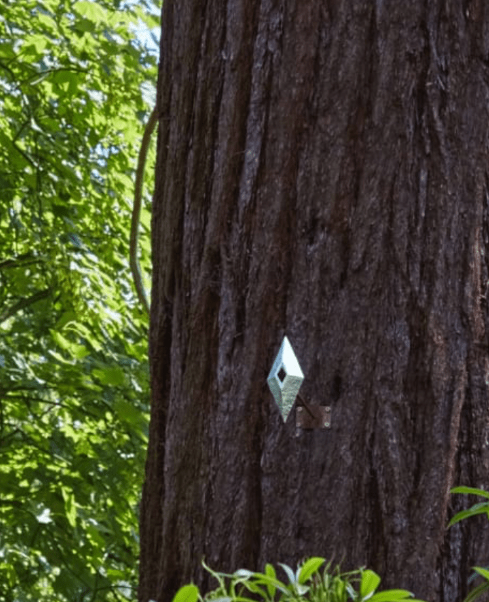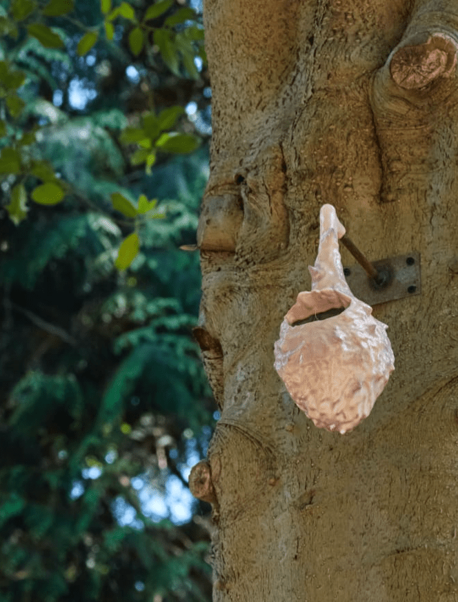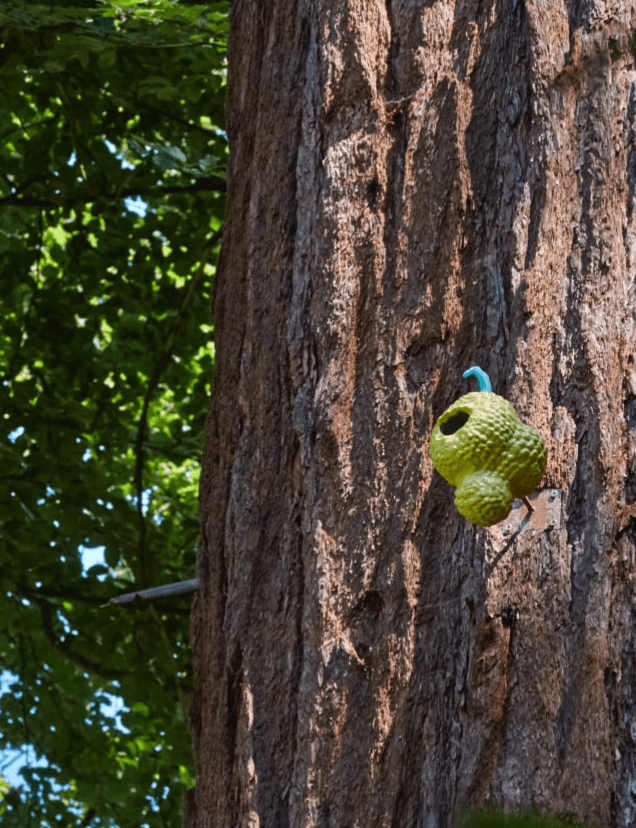 Three tiny futuristic bird boxes (all RSPB approved) by Victor Seaward are positioned high up on huge trees, ‘Thorned Nest’ 2020, ‘Diamond Nest’ 2020 and ‘Fruit Nest’ 2020 are 3D printed works. The artist taught himself to use the software over lock down and investigated the sculptural nests built by African weaver birds. Keen for local birds to take up residence in these digitally formed residences, the RSPB were consulted so that the boxes can function as actual bird boxes.